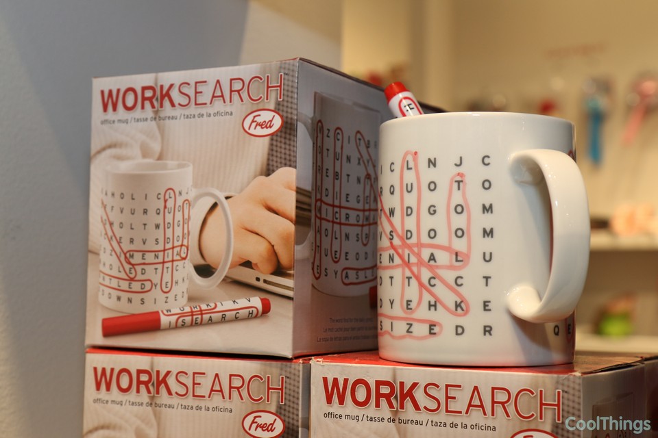 This 10-ounce coffee mug comes with a word puzzle printed on the sides, which hides multiple words related to life as a cubicle drone. You know, things like “temp,” “asleep,” “tedious,” and more. There are 23 words in all to discover, each of which you can encircle with an included marker.