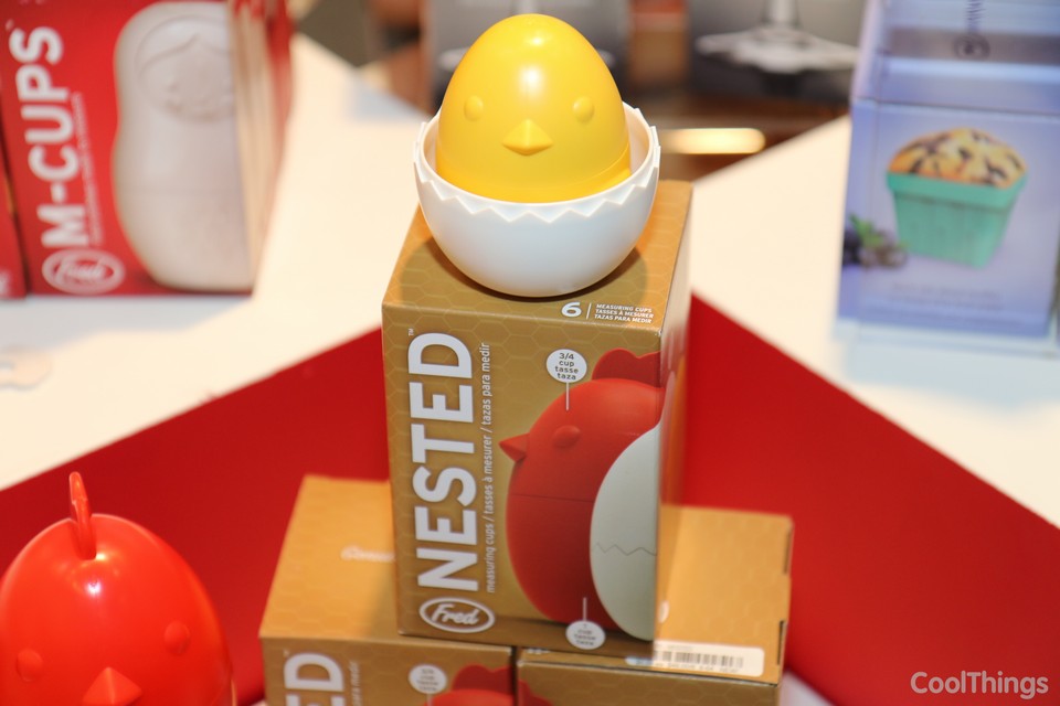 This nesting set of measuring cups consists of a mother hen that opens to reveal an egg, which then opens to reveal a baby chick. Each of the pieces (hen, egg, and chick) can be split into two halves, the bottom of which serves as a measuring cup for a specific volume, starting from a quarter cup all the way to a full cup. This should make for fun kitchen decoration when not in use, too.