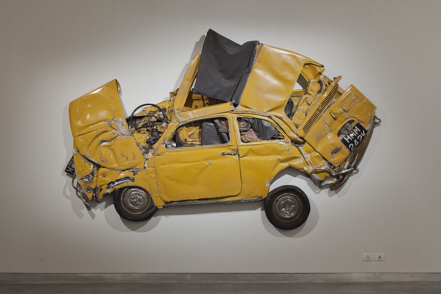 The installation includes six of the vehicles crushed into what’s essentially a two-dimensional form that you can push up a wall for adorning it like a painting of mayhem and destruction.  According to Arad, who has been working on metal as a medium for the past 30 years, he wanted to explore “the way in which automobile bodies, specifically the Fiat 500, behave under compression.”  Well, here’s the answer to his curiosity and it’s, admittedly, quite a sight.  In a room near the installation, by the way, the artist also offers a digital simulation of the crushing process, so you can watch a close approximation of the mayhem ensue.