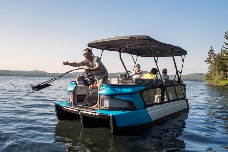 Unlike traditional pontoons, it’s equipped with handlebars for steering, so maneuvering it should feel as intuitive as a jet ski or a motorcycle, with throttles allowing you to quickly speed up and wind down as needed. It also has an “intelligent brake & reverse system” that allows the boat to stop quicker, giving you more control and maneuverability when driving in low speeds. Of course, the addition of a reverse also makes getting out of sticky spots, along with docking and launching the boat, a heck of a lot easier.
