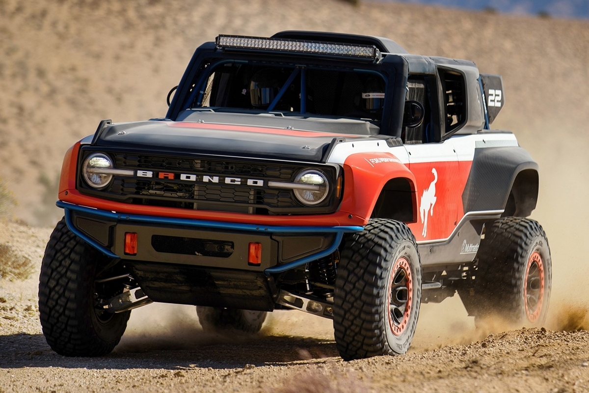 The 2023 Ford Bronco DR is built on an erstwhile standard Bronco SUV chassis, albeit one that’s equipped with a 5.0-liter Coyote V8 engine. While Ford hasn’t given final performance numbers for the powerplant, they did say they’re targeting around 400 horsepower, so it should pack plenty of muscle to propel this thing on the sands. Once all is said and done, the outfit is hoping this will end up being the most powerful production Bronco ever made. That engine is mated to a 10-speed automatic transmission and transfer case that’s taken right out of the Ford F-150 (the regular one, not the electric Lightning), with electronic locking differentials at either end of the truck to send all the available torque to the grounded wheels whenever they need it, making it all that much easier to get out of sticky off-road situations. It uses 3.0 Multimatic DSSV spool valve shocks with finned external coolers, which should help drivers maintain control even at higher speeds, while the off-road suspension system gives it 15.8 inches of front travel and 17.4 inches in the rear.