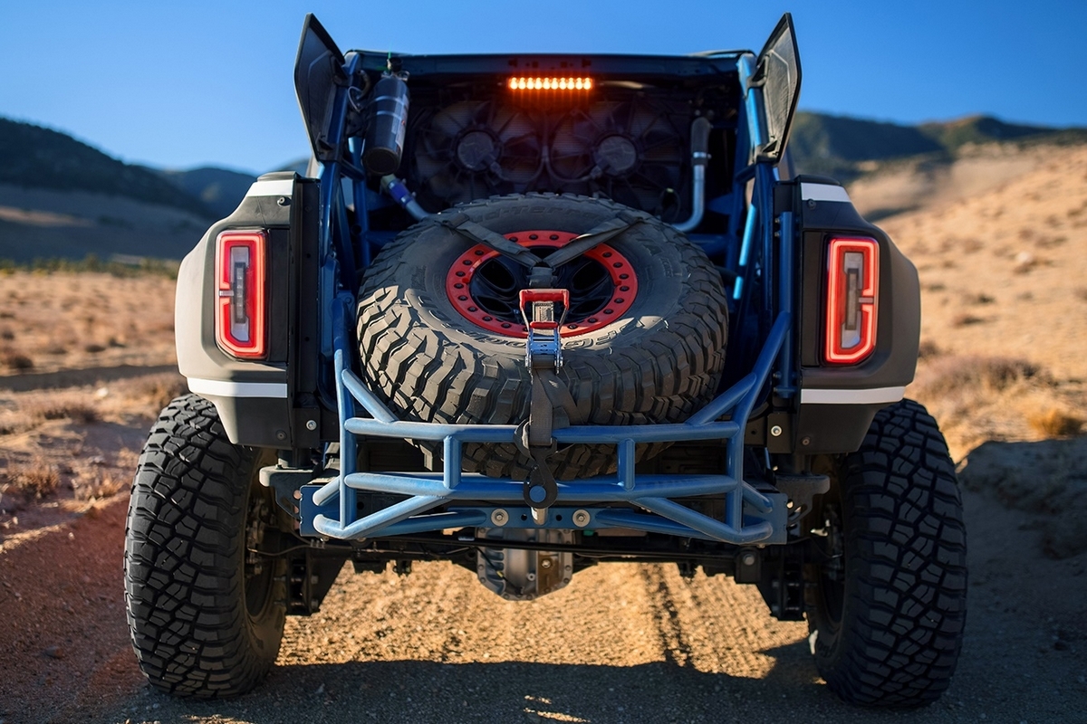 Inside, the cabin gets many stock items cleaned out, from the air conditioning system and the comfortable amenities to the numerous glass panels. In its place are a bunch of racing-specific elements, such as a dashboard with pre-wired switches for all sorts of equipment and a detachable steering wheel, with sporty racing seats for two people. Yes, it only sits two despite having the same four-door chassis as the regular Bronco, with the rear space taken up by a rear-mounted radiator with massive air intakes along the roof and an enormous 65-gallon fuel tank that should give it a whole lot of range. It tips the scales at 6,200 pounds.