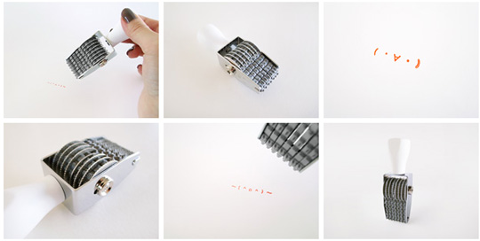 The Kaoiro Emoticon Stamp is a 1.3 x 1.1 x 3.9 inch stamp, made from wood, rubber and steel. Sporting seven belts and 20 different symbols, you can use it to lay down up to 2,000 different Japanese-style “kaomoji” (emoticons). It works just like any multi-belt rubber stamp, so just adjust the belts, dip it in ink and mark away.