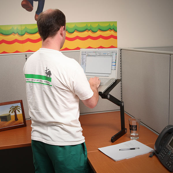 Throw it on top of your regular table at work, slap your laptop on there and presto — you can now put your fat ass to work while standing to burn more calories.  Heck, you can even work on that product render while shaking your money maker if you’re up to it.  You can also lower it, of course, once you realize it’s much easier to work with your backside parked on that USB Cooler Cushion.