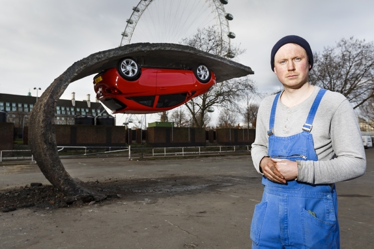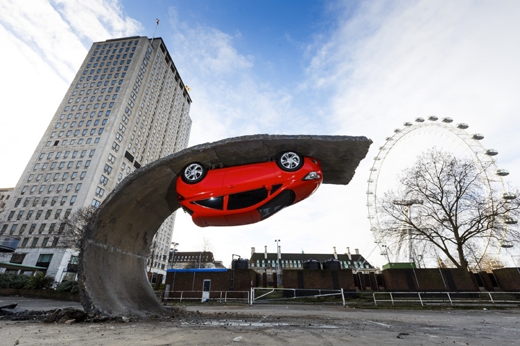 Made by Alex Chinneck for Vauxhall Motors, the sculpture suspends a new Vauxhall Corsa in the air, attached to a patch of road curving upwards in a half-loop. It’s an amusing sight, to say the least, and will likely make its way on several YouTube videos of teenagers pretending that they’re using telekinesis to carve a road like a telekinetic mutant or something.