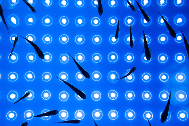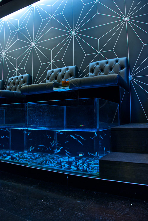 Aqua Sheko’s interior was designed by 7Gods, who used a dark décor to help highlight the hordes of fish swimming in lines upon lines of tanks and floor-mounted tubs. In fact, the design theme makes it look more like a night club than a beauty spa, with black class cladding the furniture, cold lights, geometric wall patterns and a generally somber mood.