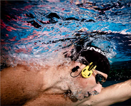 Made by Finis, the AquaPulse is a three-inch dongle that you wear on the inner side of your goggle strap, with an accompanying clip that attaches to your earlobe.  Heart rate measurements are done using an infrared sensor, which detects subtle changes in your skin color to account for capillary blood flow.  The numbers are then dictated to your ear via the cheekbone using bone conduction technology.
