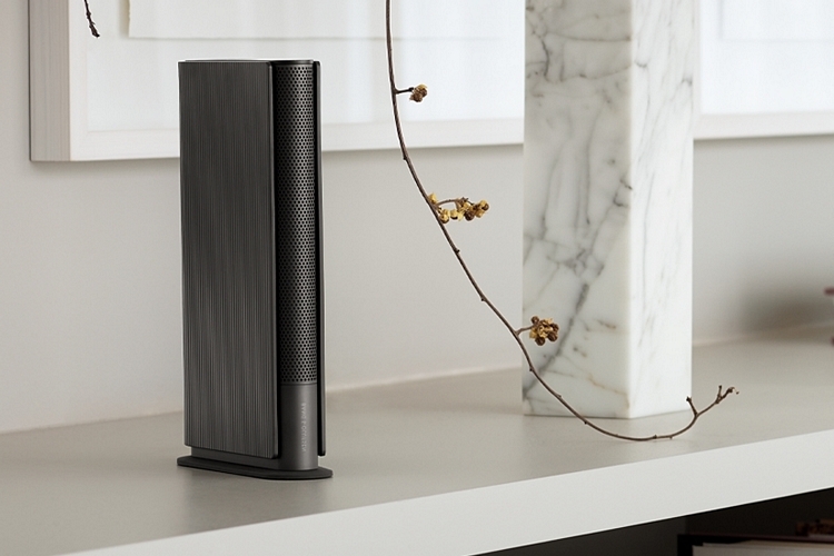 The Bang & Olufsen Beosound Emerge is equipped with a 1.45-inch mid-range drive that’s mounted at an unusual angle to accommodate the speaker housing’s slim profile and a 0.6-inch soft dome tweeter, each of which are driven by individual 30-watt Class D amplifiers. There’s also a side-firing 4-inch woofer doling out the low frequencies in all directions, regardless of how it’s positioned, beefed up by a 60-watt Class D amplifier, with an integrated bass port in the rear guiding the low end sound to make it deeper and richer.