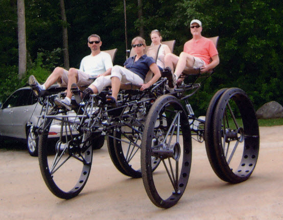Body is built out of 4130 chrome-moly steel tubes, chrome-moly steel plate and various recycled bike parts.  It uses brakes, axles and rear hubs fleshed out of go-karts, with spindles and rims out of golf karts. For the large outer rims of the wheels, they used a drainage pipe, connected with spokes. Oh yeah, all four seats on top are made from repurposed lawn chairs.