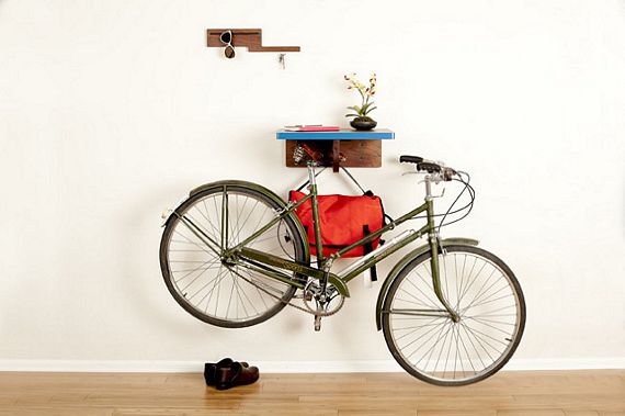 Aside from suspending your bike, the Bike All also comes with extra hooks on the bottom where you can hang your messenger, lanyards and other strapped items.  The top side of the storage panel acts as a shelf where you can set down your helmet, gloves and riding accessories.  You can also use it to display vanity pieces if you need the extra decor.  It measures 20 x 16.5 x 7 inches (l x d x h), with walnut hardwood construction.