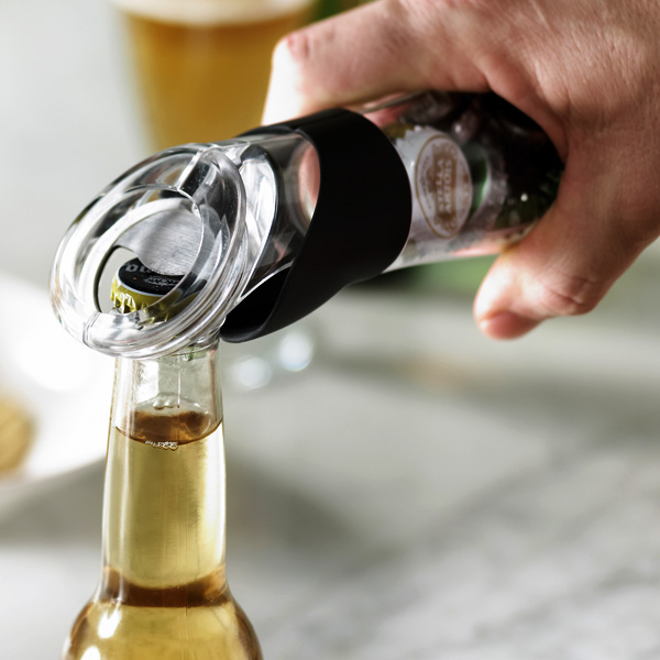 The tool actually looks like a bottle itself, except the top consists of a cap-popping lever with a fitting around the neck to catch the caps before they fall off. A removable bottom lid lets you clear up the collected pile into a trash bag (or your roommate’s bed, if you’d like to give them a surprise when they hit the bunk).