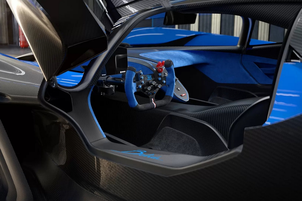 Inside, it has a two-seat cabin with little wasted space. The seats, for instance, are fixed in place, making it difficult to use for taller individuals (people over 6’5’’, according to Bugatti), with the low-slung profile requiring you to follow a specific ritual for getting into the cabin, namely sitting on a sill, placing your feet in the foot well, and shifting your weight into the seat until you’re set. Once there, you get a rectangular steering wheel, adjustable pedals (up to six inches of travel), and a digital display for keeping track of vital information.
