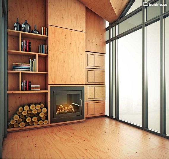 The Bunkie features a frame done up to resemble the traditional silhouette of a house, complete with a chimney on one side. Construction is plywood and reclaimed barn boards for the frame, with glass walls for the front and the rear. Since it just has a single open layout, the cabin is equipped with furniture items that fold into the wall, including a dining table that hides over the fireplace, folding chairs hung next to it, and a pair of queen-size murphy beds on the opposite side. Shelf racks cover the remaining open areas of the wall. Granted, you’ll probably want a couch and a coffee table somewhere in there, too, but you can probably make that your personal carpentry project, instead.