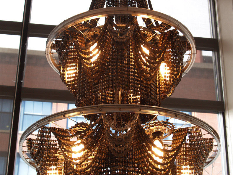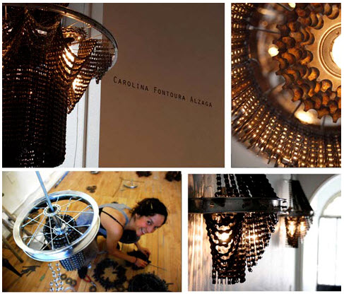 Carolina’s innovative chandelier sculptures use different bike parts throughout their construction. While the draped chains are the most easily visible, a closer look should show you the rest of the ensemble: rims, wheels, gears, tubes and a whole other slew of erstwhile junk parts are integrated into them.