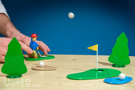 Yes, it’s a tabletop golf course that looks stupid enough to be entertaining.  A perfect fare for cubicle-dwellers who want to kill some time while the supervisor isn’t looking, you can play one hole or 100 holes – just rearrange the course to your liking.