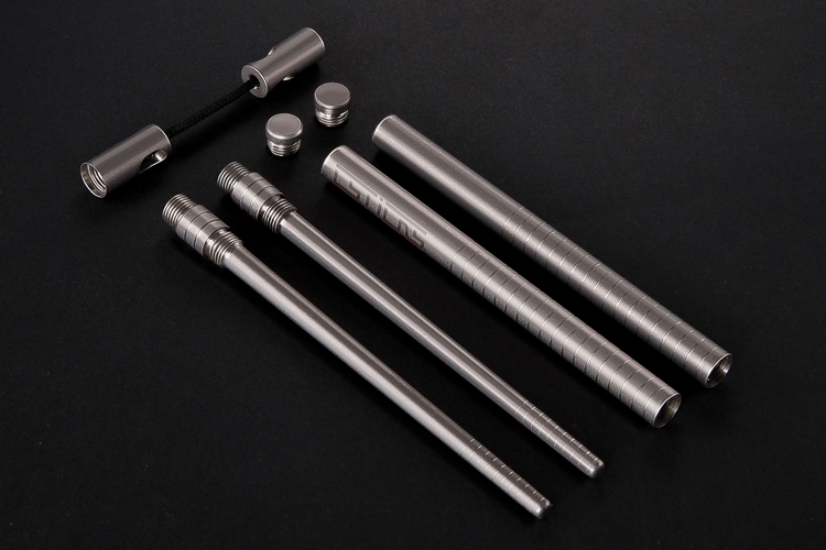 Construction is either stainless steel (raw or stonewashed finish) or titanium, so this thing is going to be tough, regardless of which build you choose to get. They should be pretty easy to clean as well, since the tapered section (the part that actually touches any food) is completely smoothed out, so there are no grooves or corners where food can get stuck in. It measures 4.6 inches when collapsed and 7.5 inches when outfitted into its full nunchuks glory.