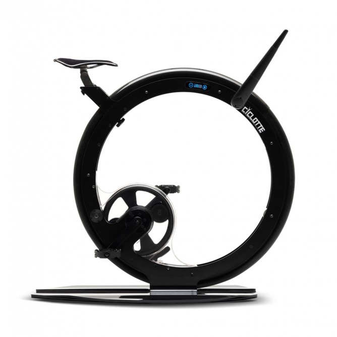 The Ciclotte is made from steel, carbon and glass fiber materials that combine into a sleek and original monowheel form. Plop your crotch on the saddle and begin pushing the pedals to get the dual satellite epicycloid system going. If that sounds scary, don’t worry – it’s just an unusual set of gears that spins the magnetized main wheel. Resistance is provided by the magnetic field produced from the wheel’s spinning motion, working your lower extremity muscles and increasing your heart rate like every good stationary bike should.