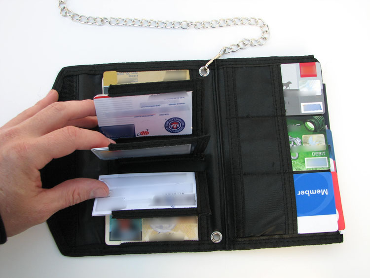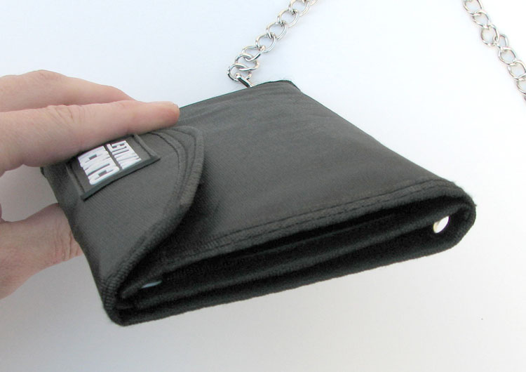 The Clinch Wallet measures 7.5 X 4.5 (W x H) when closed and opens to 11 inches of width. It’s made from heavy-duty polyester and comes with three larger pockets (for bills and passports). They bundle it with a removable chain, just in case you like stuff hanging out from your pants.