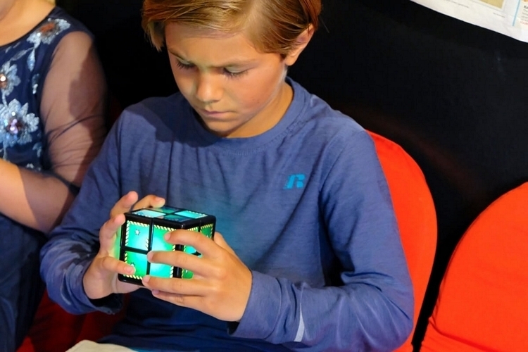 A cross between traditional puzzle games and handheld video games, the toy can be twisted for matching different screens together similar to classic cube puzzles. Except, the twisting, along with shaking, are actually the main control mechanisms for interacting with its integrated games, creating an entirely new way of playing that enhances hand motor skills and hand-eye coordination in a way that other screen-based games just can’t offer.