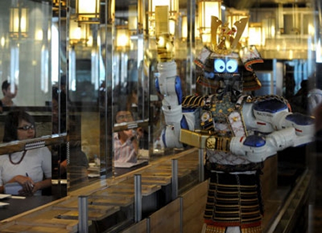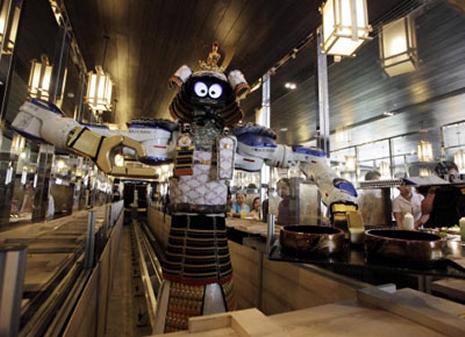 Dancing and singing waiters? Been there, done that. How about Dancing Samurai Robot Waiters with goofy eyes and a toothy grin? Bring it on, right?