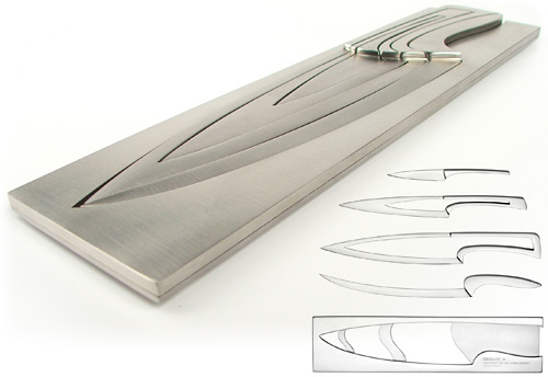 The brainchild of designer Mia Schmallenbach, the lines of each knife were plotted using the average width of a hand as base, with the length of successive Fibonnaci numbers determining how the sides curved. Despite the seemingly arbitrary process, the result is an elegant set of four knives nestled inside each other’s frame, all of them stacked within a single block.