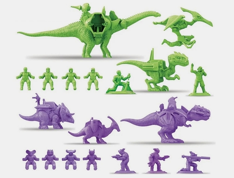 The set comes with a total of six dinosaurs and 15 figures, comprised of both Valorians (the good guys) and Rulons (the bad guys) alike. Neither the dinosaurs nor the figures are articulated, as these are fixed figures similar to the classic Green Army Men everyone has played with through the years. That means, the dinosaurs and figures all come in solid block colors, green for the Valorians and purple for the Rulons, with all of them in fixed poses. Do note, some of the figures are designed to be mounted on the dinosaurs, essentially piloting them like they’re operating a tank, while the rest are designed to stand freely on a tabletop for creating a battle diorama like you used to do with those little green soldiers.