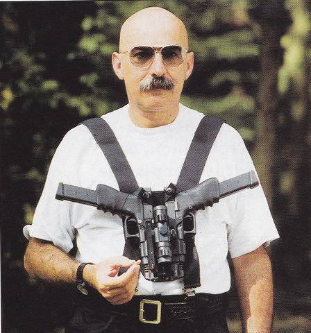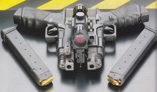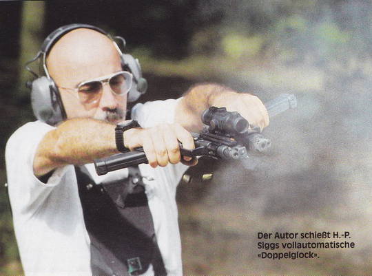 There aren’t much details available about the Doppelglock, other than some photos posted by a user named Casatic on Livejournal (which appear to have been scanned from a European magazine).  The double Glock build looks amazing, however, even if the body holster does border on hideous (not to mention, absolutely ridiculous).