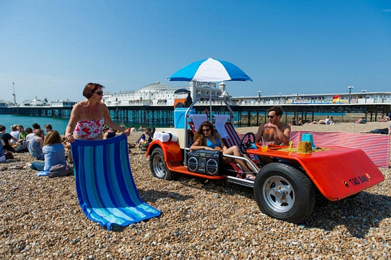 Designed by Solomon Rogers, the Driveable Deck Chair puts a pair of deck chairs on top of what appears to be some sort of buggy chassis (it looks kinda like one of CT&T’s amphibious vehicles, except with four wheels), complete with a running drivetrain and all-terrain tires for capably cruising across sandy terrain. It comes rigged with an integrated parasol (of course), wind breakers (that also double as privacy covers when needed), retractable towels mounted on top of the chairs, a sandpit (so you don’t even have to get off to build sandcastles), a refrigerated slushy machine, a stereo system, and designated storage slots for sunscreens, drinks, and reading materials. Oh yeah, it’s equipped with a GPS tracker that can follow the sun, directing you on where to park the vehicle to ensure maximum shade levels. Seriously.