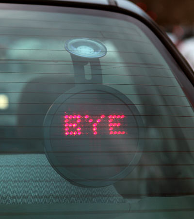 Finally, a way to let other drivers know what you would normally mutter to yourself inside the car.  No more screaming out the window or honking like a madman too.  Thinkgeek has the Drivemocion LED Car Sign for $30. It uses four AA batteries, enough to last it an estimated four months.