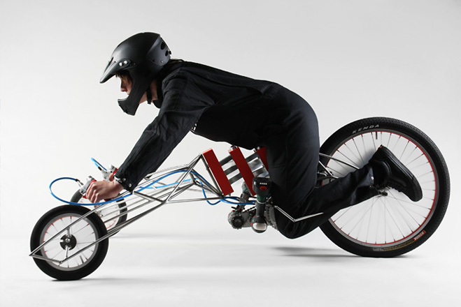 Frame sports an open design, having been inspired by skeletons with their organs exposed (no, really).  Drive components were sourced from modified bike parts, while the unique steering joint was custom-milled using a CNC machine.