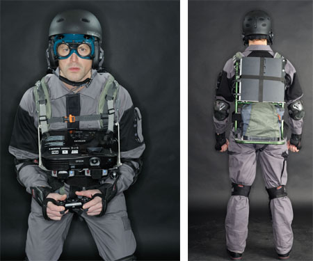 In the ad, the protagonist wears Epson’s 3LCD 720p machine on his chest, splaying its output across building walls, club ceilings and other places, all while furiously tapping on a controller for the PS3 strapped around his back. Yep, it’s a portable gaming rig of the absurd kind – the type that can get you killed in a bad neighborhood (or while crossing a busy intersection). Oh yeah, I guess that’s what all that protective gear is for.