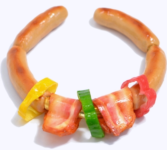 Is it pretty? Hell, no. Will you look stylish wearing it? Hell, no. Do you feel an uncontrollable urge to want to wear it anyway because you’re a human who’s too weak to resist the magnetic attraction of a necklace made with four life-size sausages, two slices of bacon, and three slices of pepper? Yes, yes you are.