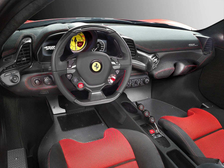 On the aerodynamic end, they took out  the “base” model’s bendable wings in place of two massive air dams, they added wings on the side of the chin to smooth airflow, and threw in another pair of wings at the back to calm winds as it rushes over the rear, among a load of tweaks.  So you can “toy” with your Ferrari like an out of control 13 year old, it comes fitted with Side Slip Control (SSC), which optimizes torque management and torque distribution betweem the two wheels to improve vehicle control.  Other notable details include a lighter weight (1,290 kg, down from 1,380), carbon fiber seats, and Michelin Pilot Sport Cup 2 tires.