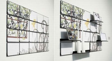 Created by Chicago-based designer Mark Kinsley, Fold Out consists of a mural painting sectioned off into multiple panels. Each panel is mounted individually, with a fold-out mechanism that allows it to convert into a wall shelving after one simple motion.