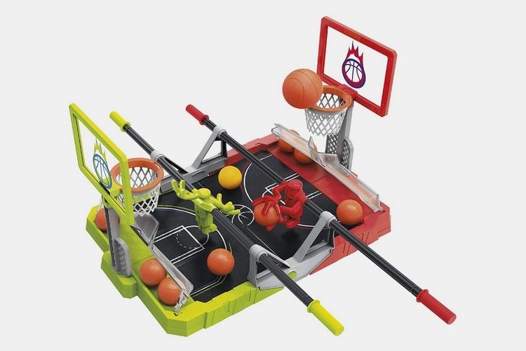 Instead of playing with one ball like in a regular basketball game, it comes with 10 balls that players can pick up and shoot. Why so many? We’re guessing because it’s not easy to score on this thing and 10 balls keeps the game going, instead of stopping the play while they wait for the ball to roll back into a space where it can be grabbed by your player. The official rules state that the orange balls are worth a point each, while the sole golden ball nets two points. First player to score five points win the round. We have a feeling kids will make up their own rules for this, though, since that will likely be half the fun of playing.