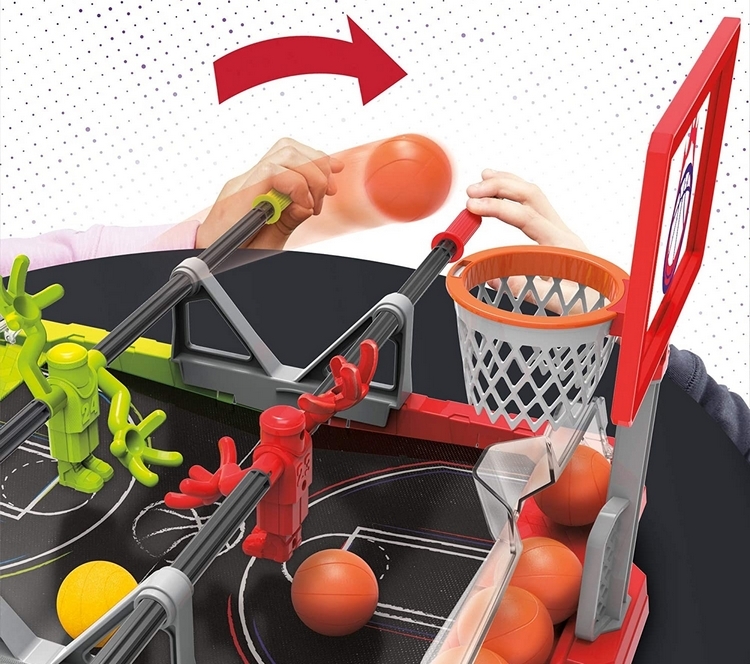 The game consists of a playing court divided into two halves, with each of the players standing behind the half court line on their side. Like in foosball, the players are held on a rod with handles on the left and right sides, allowing you to move them laterally for blocking shots and turn them clockwise-and-counterclockwise. Instead of turning them to kick the ball, however, the turning motions actually control the players’ hands, as it’s the movement used to both grab the ball and shoot it.