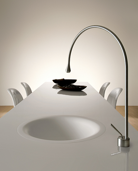 Need to wash your hands before dinner? Forget about getting up and running to the sink. Just slide your chair over to the end of this concept furniture promoting the Gessi Goccia Kitchen Faucet, which features a dining table with an integrated water faucet and sink.