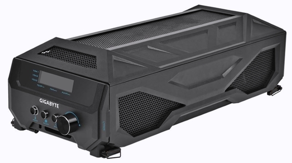 Rather than a single card, this rig actually consists of three SLI graphics cards, all of which are hooked up to a dedicated radiator to handle cooling duties. This radiator, by the way, is so big, it ships in its own case. And, no, it’s not a small case, with dimensions big enough to cover the entire top of a standard gaming tower (it should house a mini-ITX PC easily, with room to spare).