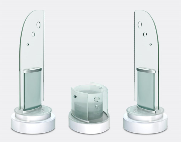 Different areas of Greensound’s glass speaker produce different frequencies of sounds, with the curved portion at the top creating high-frequency, the center part delivering the mid-range and the low frequencies coming out of the area near the bottom. A sound generator installed at the base of the device controls the vibrating action.