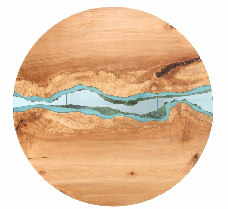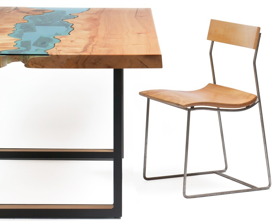 Each of the pieces in the River Collection Tables all use the same concept.  The artist handpicks discarded timber from around the Pacific Northwest where he lives, then sculpts them into half of a tabletop with one intentionally rough side.  He then joins two pieces of the handcrafted slabs by inserting a blue-tinged glass that’s hand-cut to accommodate the wooden tops’ uneven edges, then sets them up on erstwhile traditional table legs and frame.  Boom, you’ve got what looks like a body of water running in the middle of your dining room set.