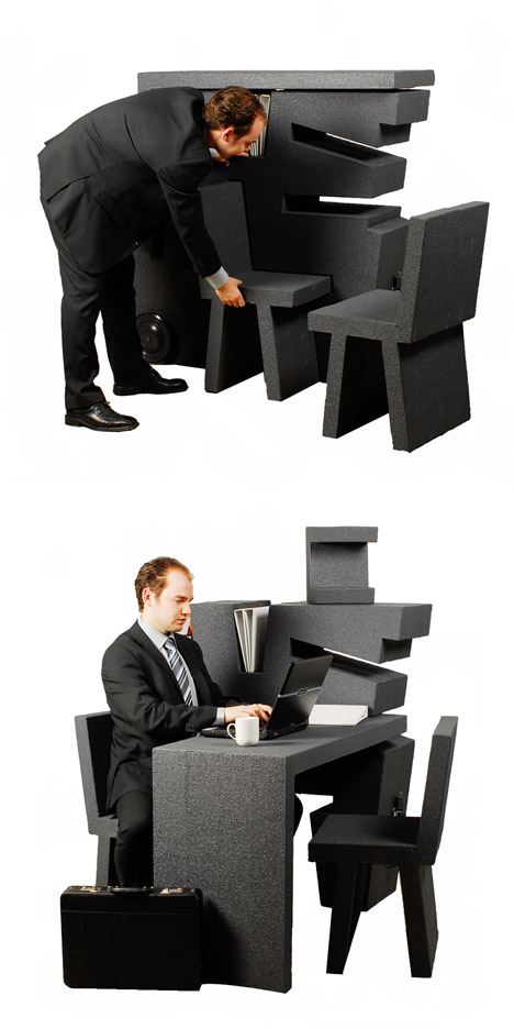 Created by designer Tim Vinke, the setup is essentially a desk, shelves and two chairs clad in the form of a modular wheelbarrow.  Slap them together like Lego blocks and you’ll end up with a pushcart (yes it has wheels on one corner) you can transport anywhere in your building or somewhere within walking distance.  To get your makeshift office ready, just take them apart and arrange the individual pieces anywhere you’d like.
