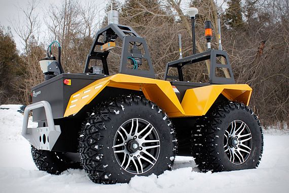 The HexHog uses six wheels set up on an articulated chassis that flexes to ensure all wheels maintain contact with the ground, regardless of the terrain you’re traversing. It features all-wheel drive for maximum off-road traction, with a zero turning circle for high levels of maneuverability. The 6×6 transmission is fully sealed and the drive motors raised high to provide access to snow, swamps, and other wet terrains. It uses an electronic drive architecture, with the entire thing operated from a programmable joystick.