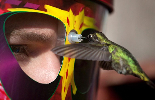 Created by Doyle Doss, the wearable bird feeder has a feeding tube between the eye holes, about an inch right above your nose. That way, you can really watch the vibrating flyers up close, all while getting cross-eyed and looking stupid in the process.