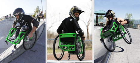 Designed by Joven de la Vega, the unconventional wheelchair has been fine-tuned to work at most any course a skateboard can. Fast and rugged, it goes past mere motion, allowing the rider to perform tricks just like skaters and bikers have been doing for so many years.