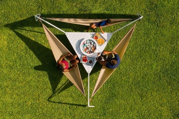You know how a typical patio lounge will consist of a table, a few chairs around it, and a large umbrella in the center to give you shade during sunny days? Well, that’s what you get here, except the chairs are actually hammocks that you mount on the integrated posts, so you can share snacks and drinks with the family while sitting, napping, or rocking back-and-forth on a comfy hanging sack.
