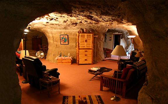 Kokopelli’s Cave Bed & Breakfast consists of one 1,650-foot cave that’s been carved into a 65-million-year-old slab of sandstone that stands 280 feet above the La Plata River. It’s not a natural cave – they blasted, drilled and excavated the damn thing in order to build a habitable area 70 feet below the surface. They reportedly started working on it in the 1980s and eventually declared it ready for occupation in 1996.