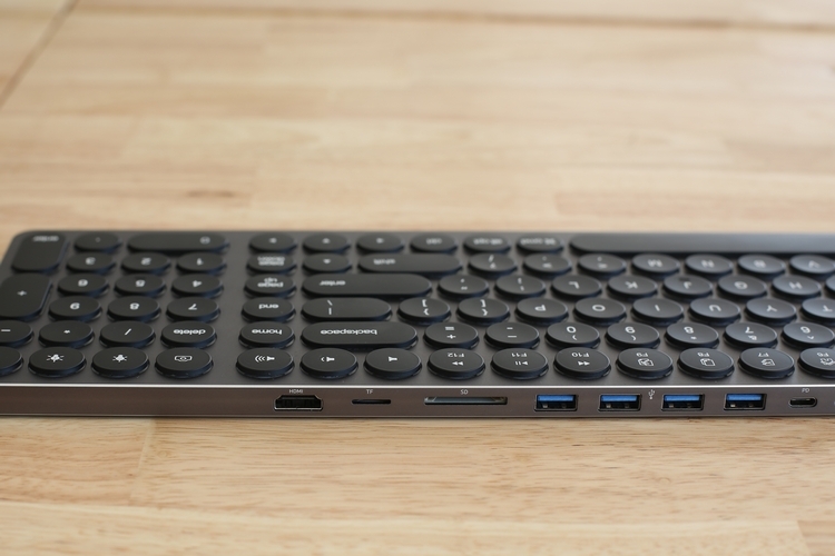 The Kolude DK-K1 Keyhub has an HDMI slot for adding a second monitor, as well as a USB-C slot for easily connecting to any modern computer or tablet equipped with the port. There are three USB 3 slots, one USB 2 slot, and a USB-C PD charging port, so you can plug and charge a whole load of USB devices, as well as a TF card slot and an SD card slot, which makes it a great accessory for folks who shuffle through card storage regularly. When you plug a monitor into the HDMI, by the way, it supports up to 4K at 30 fps, so you can get really good visuals using this between your PC and an additional display.