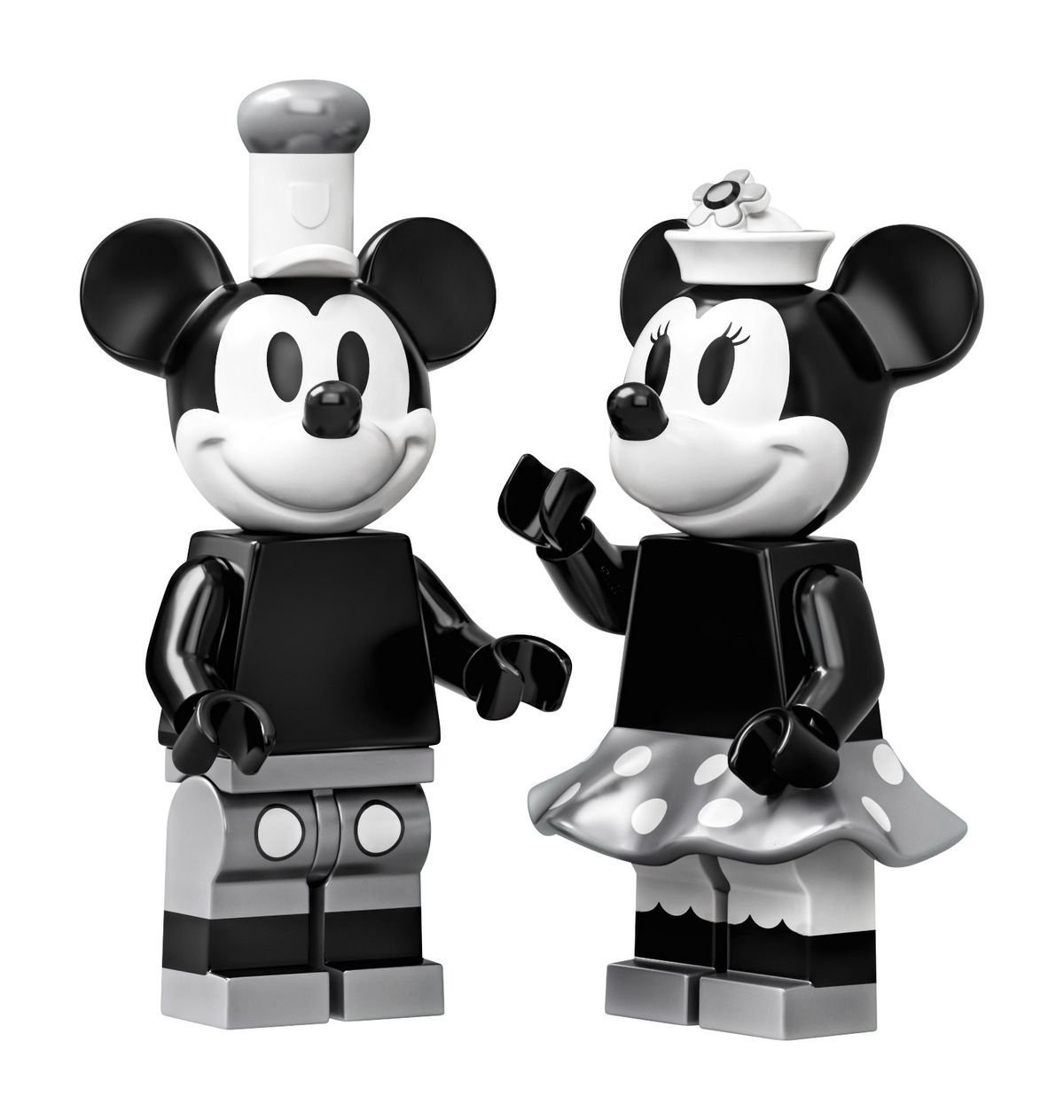 This unique toy building set includes 2 new-for-April-2019 minifigures: Mickey Mouse and Minnie Mouse, each with silver-colored decoration, plus Mickey Mouse’s parrot figure.