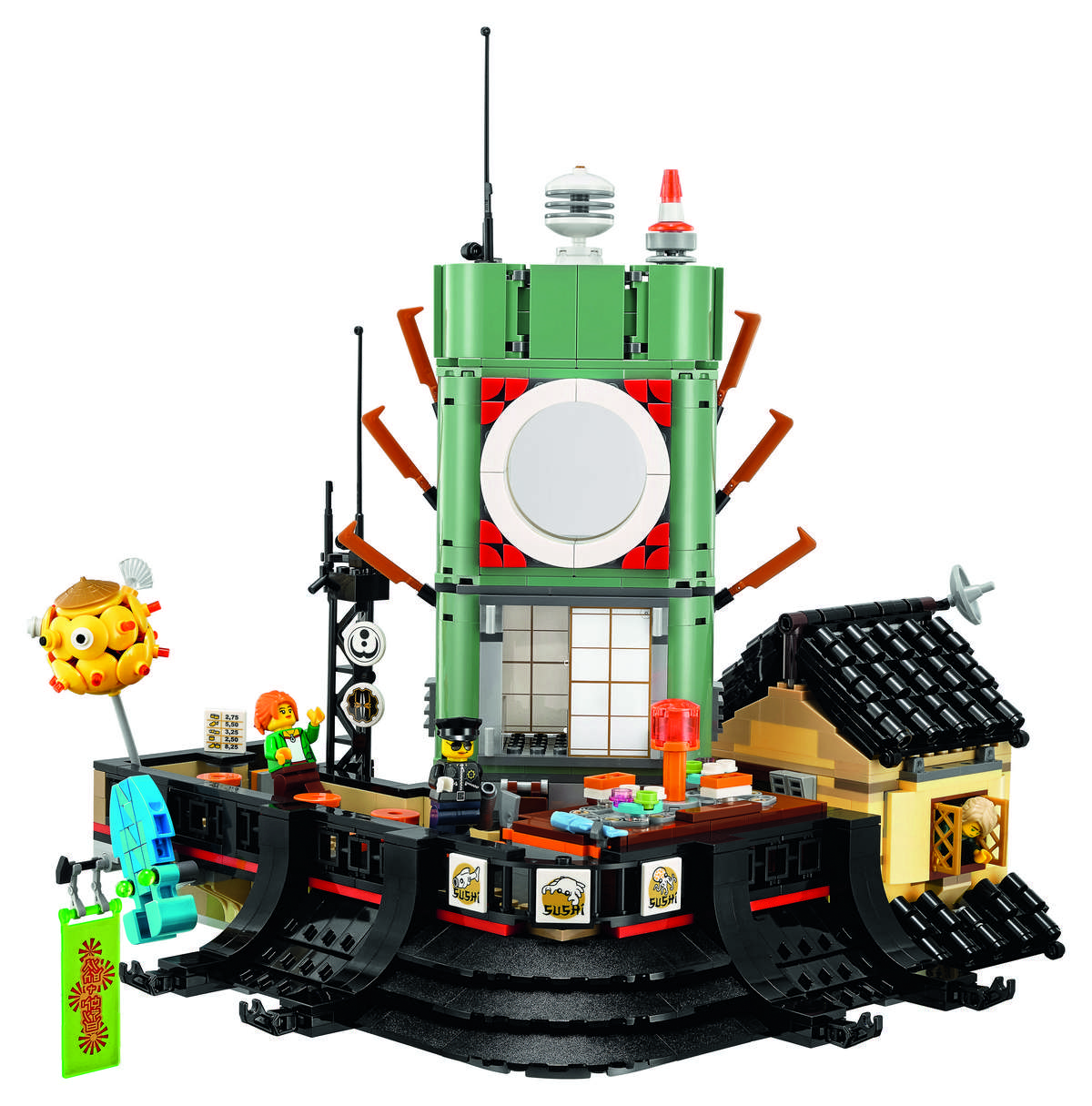 Up at the top floor, you get a radio tower, a modern rooftop sushi bar with a sushi conveyor belt (turning the integrated dial lets you get the belt moving), a bathroom, and an apartment belonging to Lloyd and Misako. The apartment, as usual, comes heavily detailed, with functional windows, a bunk bed, a kitchen unit, and attic space for hiding Lloyd’s ninja suit (which is actually a ninja minifig). All the stores, stations, and restaurants across the three floors come decorated with numerous brick elements, such as mannequins in the fashion store, seafood in the fish market, and cleaning supplies in the maintenance station, so the details are positively insane.