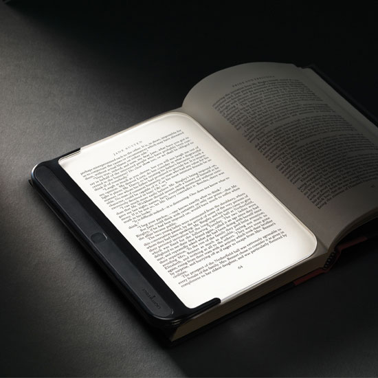 Unlike most book lights, it doesn’t just put a moveable mini-lamp on top of your reading material. Instead, it lays an optical-grade lens over the page to spread the light evenly, which, funny enough, makes it look like you’re reading from a tablet screen.